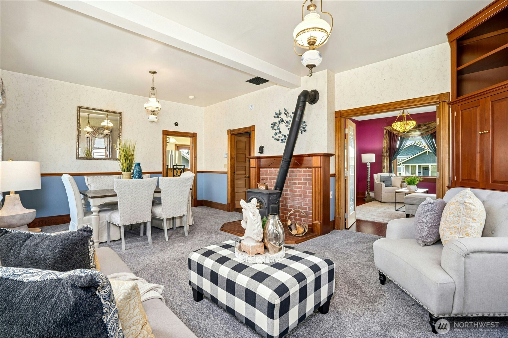 Victorian splendor in Historic Snohomish. Respectful stewardship, commissioned in 1901, it beautifully marries timeless appeal of Queen Anne Character w/modern upgrades & comforts. From textured shingles, gable ornamentation, a wrap around, columned front porch, to lead glass doors, a drawing room, rich wood molding, wood stove, built-ins, sweeps of hardwoods & claw footed tub = charm beyond compare. Rooms are spacious, light & bright. Detached 2 car garage, a 434 sq ft shop, outdoor fireplace patio & a fenced backyard adds a bow on the property. Its location in the "lettered Streets" is a quick stroll to the charming downtown, have a bowl of Chowder at Andy's, brisket at J&L's BBQ or a slice of pie at Snohomish Pie Co. Come enjoy history!